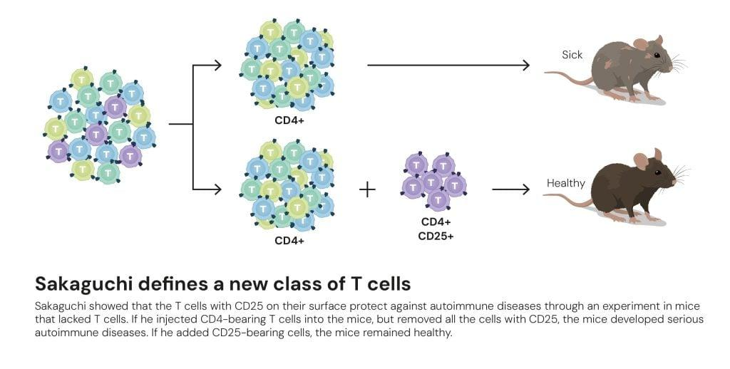 在坂口志文保护小鼠免受自身免疫性疾病攻击的实验中,他使用了表面带有CD4的细胞——即辅助性T细胞。通常情况下,这些细胞会唤醒免疫系统并使其开始工作,但在坂口志文的实验中,免疫系统却受到了抑制。他的结论是,必定存在不同形式的、携带CD4的T细胞。