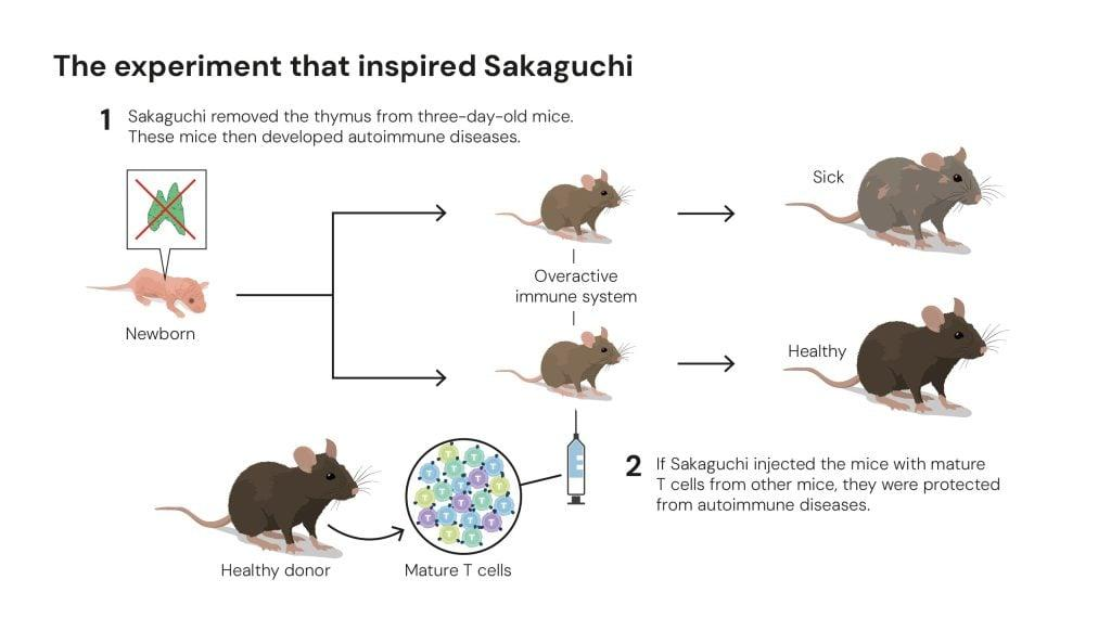坂口志文的研究灵感来自于他同事早前进行的一项存在矛盾的实验。为了了解胸腺在T细胞发育中的作用,他们通过手术切除了新生小鼠的胸腺。他们假设这些小鼠会产生更少的T细胞,免疫系统也会更弱。然而,如果手术在小鼠出生三天后进行,免疫系统就会过度活跃并失控,导致小鼠患上一系列自身免疫性疾病。